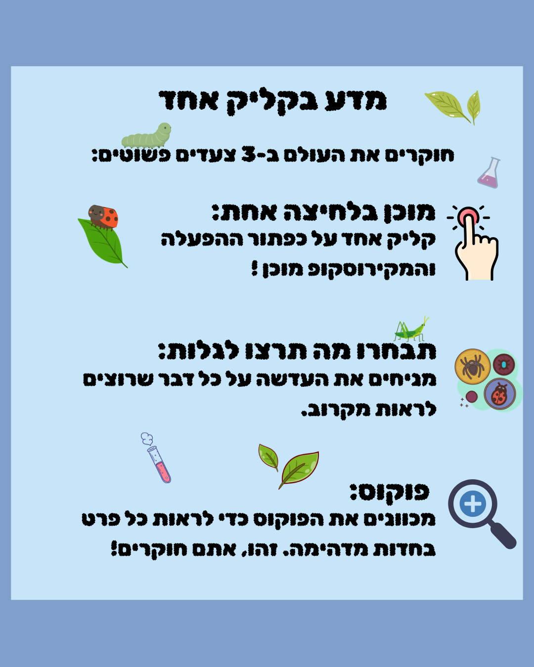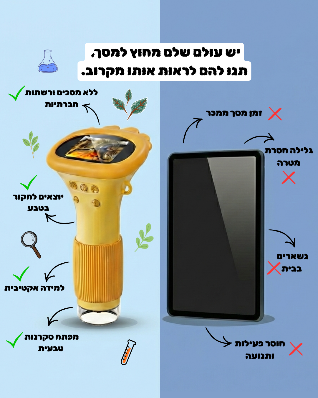 זה אומר שהילדים יוכלו לראות ממש את המבנה של העלים, סיבים של בדים, גרגירי מלח, ואפילו יצורים זעירים שאי אפשר לראות בעין רגילה! 🐜